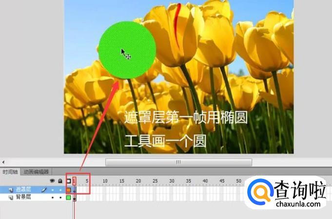 然后我们在遮罩层的第一帧处用椭圆工具画一个圆,如下图所示