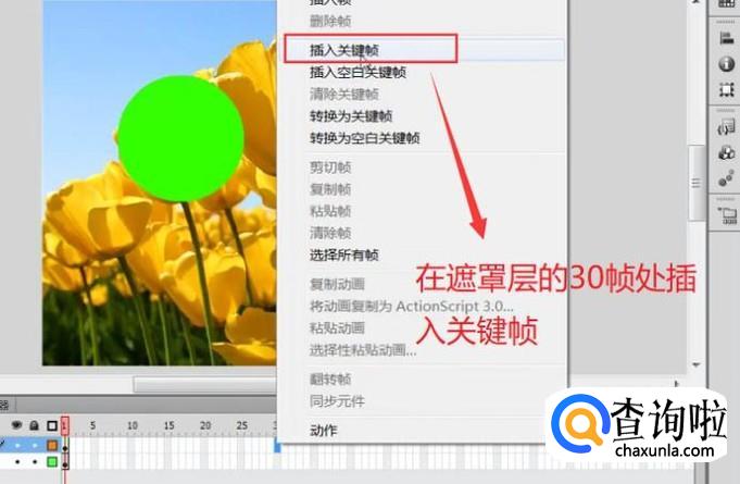 然后我们在遮罩层的第30帧处右键单击选择插入关键帧选项,如下图所示