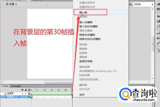 然后在背景层的第30帧的地方右键单击选择插入帧选项,如下图所示
