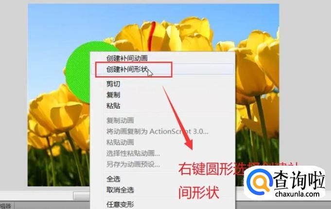 接下来我们右键单击圆形,在弹出的菜单中创建补间形状,如下图所示