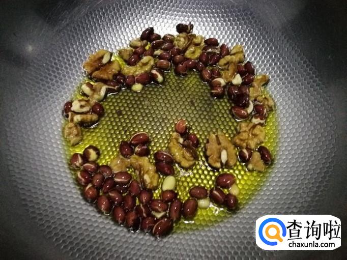 起锅烧热,下油,下核桃花生仁炒香。