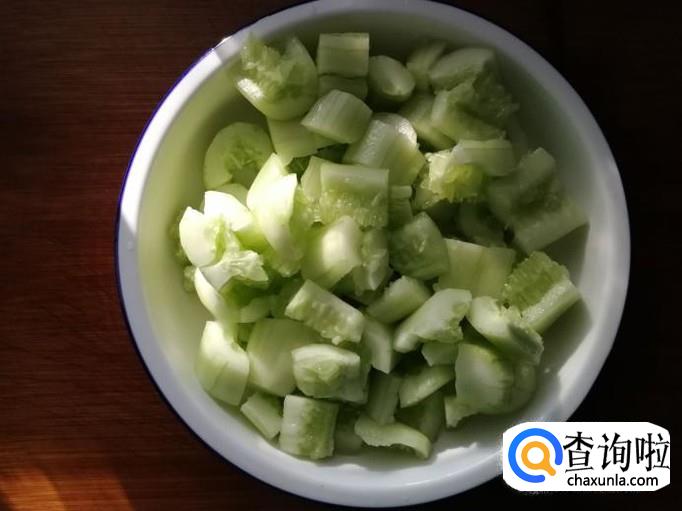 黄瓜拍扁后,将黄瓜切成小块,放到盘里。