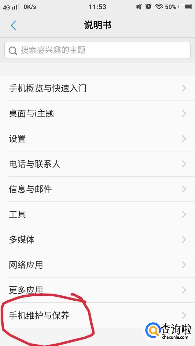 打开说明书并找到【手机维护与保养 】,并点击,如图