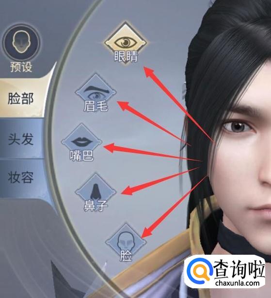 在脸部位置,可以对眼睛、眉毛、嘴巴、鼻子、脸进行设置,如图所示。