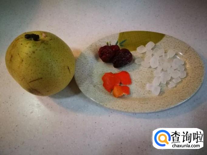 先准备梨子、冰糖、红枣、桔皮。(桔皮也有治疗咳嗽的功效,可以略加一点)