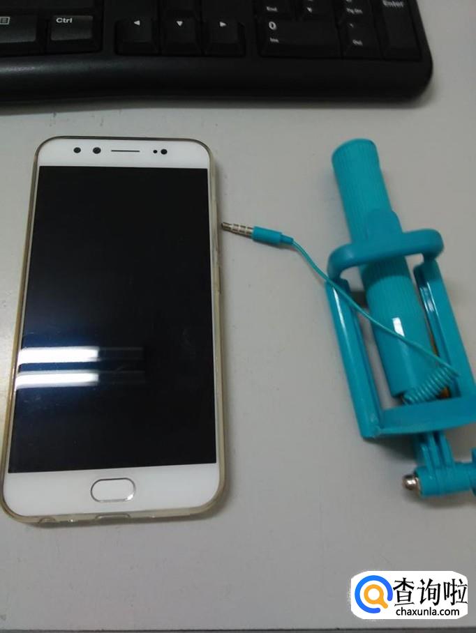 首先把自拍杆的插头插进手机的插孔中。