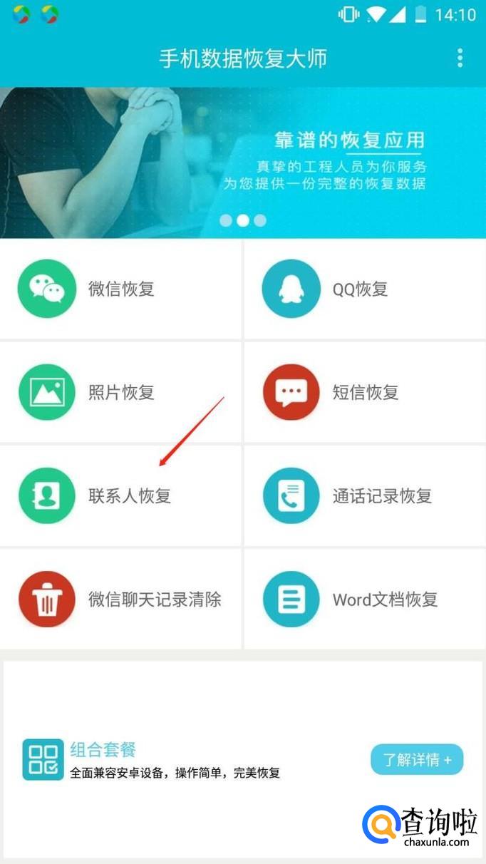 在首页可以看到,有短信恢复,联系人恢复,微信恢复等,点击“联系人恢复”