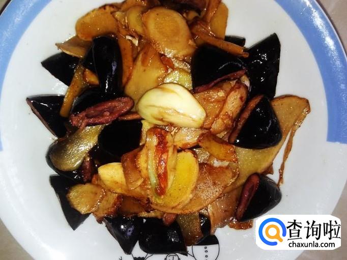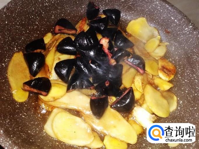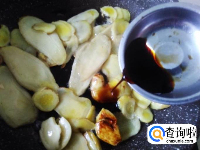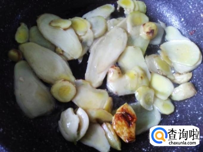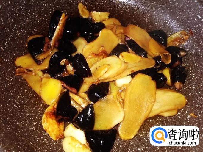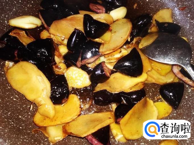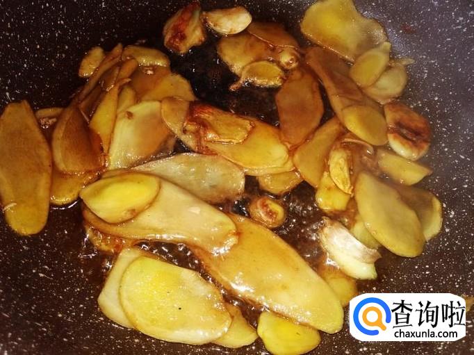 然后用小火煎炸至变焦黄色。【姜片一定要煎炸到香为止,这样乌榄才能把姜汁吸入】