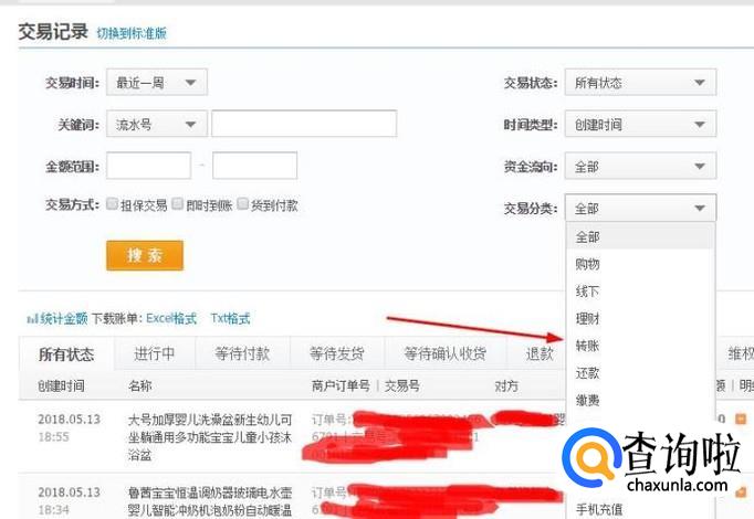 我们可以先选择日期范围,然后在交易分类处选择“转账”的选项后开始查找。