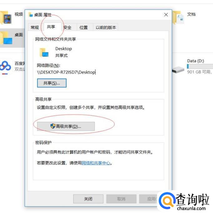 进入属性面板后,选择共享,然后点击高级共享