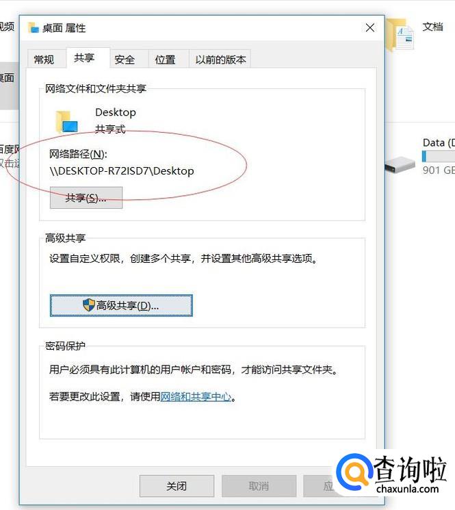 点击确定,应用后,回到属性界面,复制网络路径