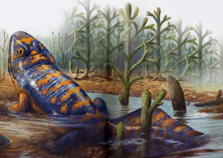 其实,在恐龙出现之前,地球上就已经出现了原始的蛙类。在距今约2.4亿年三叠纪早期的非洲马达加斯加,生活着一种长着尾巴的两栖动物——三叠蟾。它的骨骼特征已经向蛙类的方向演化,但还长着一条由多块脊椎骨支撑的尾巴,而不像现在的蛙类,完全失去了尾巴。