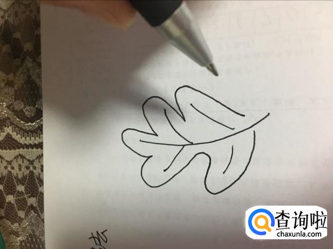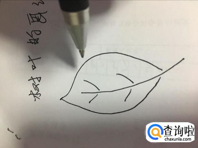 第一种,常规树叶画法。中间一根弯曲的线条,画上几根枝杈,再把树叶的外观形状勾勒出来,一片树叶就这么成型了。