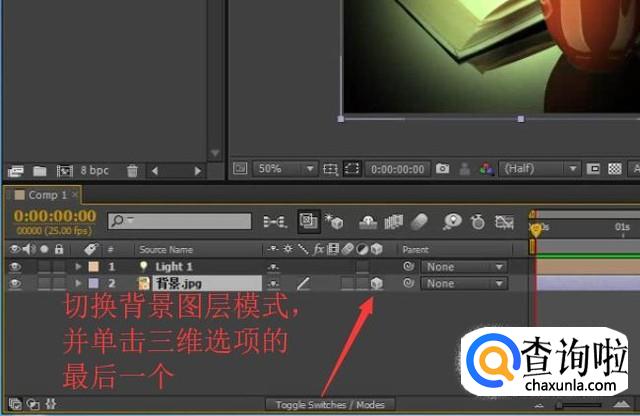 然后我们将背景拖放到时间轴上并设置背景缩放的比例为50%,如下图所示