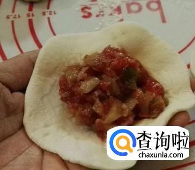 剂子用手捏成面饼,将馅放一些在面皮上,用面皮将馅完全包起来,再拍成饼状。