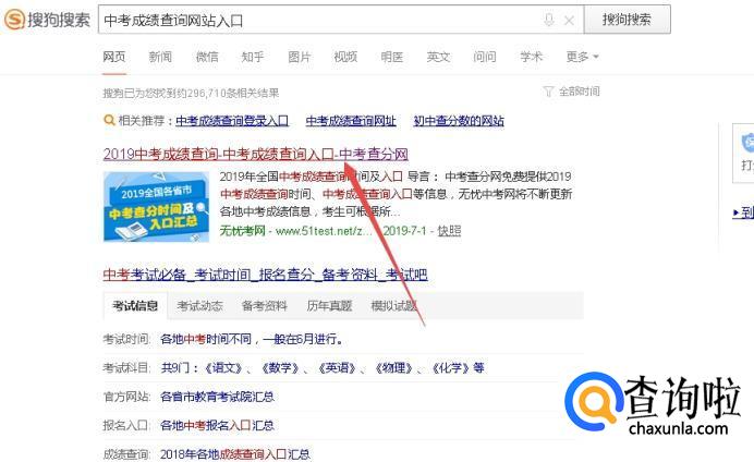 搜索以后,点击进入第一个“中考查分网”的链接。