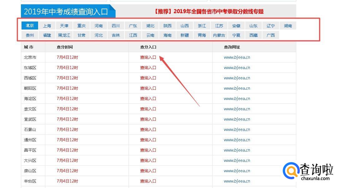 进入页面后,找到“2019年中考成绩查询入口”,下面会有省市的选项,选择你考试所在的地区,找到具体的位置,点击中间的“查询入口”。