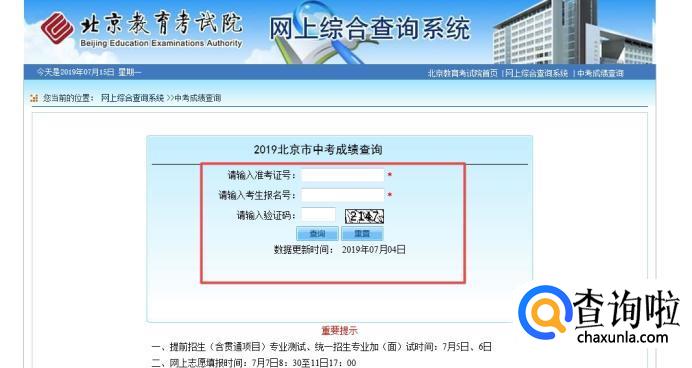 接下来,我们可以看到“查询入口”下有可点击的网页链接,找到“2019北京中考成绩查询入口”,点击哪个都可以。