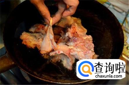 锅里多倒一些油,烧热之后把鸡架放进去,用筷子不断翻,让鸡架均匀受热。
