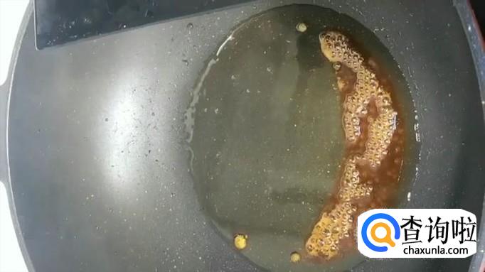 【熬糖色】起锅烧油,下入冰糖,熬制酱油色