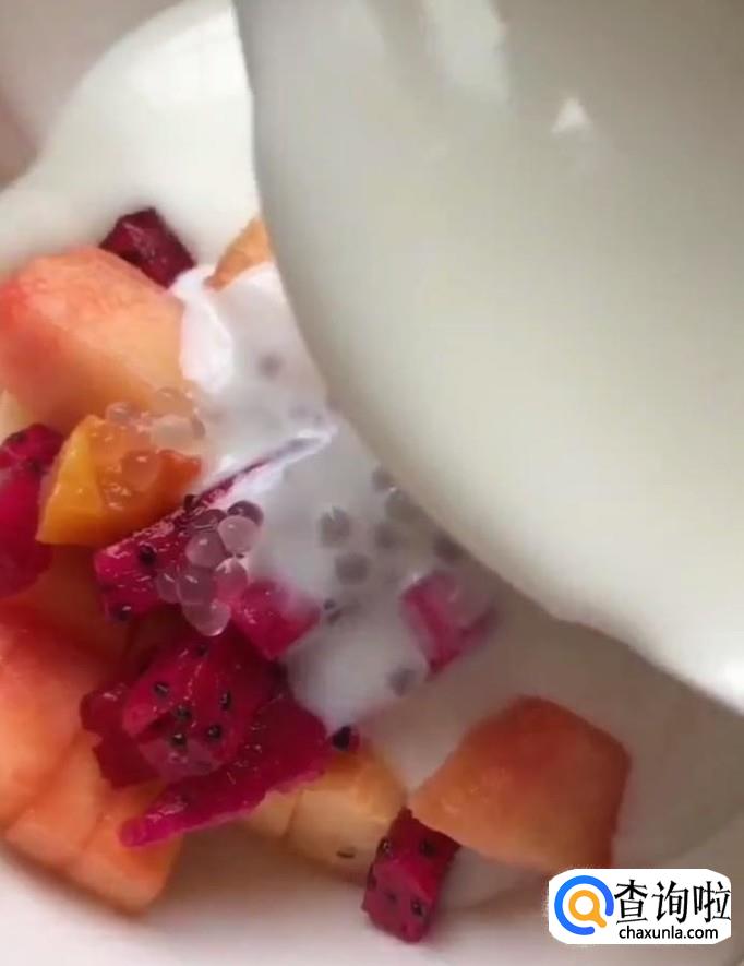然后我们准备一些自己爱吃的水果切块放入碗中,倒入调好的牛奶