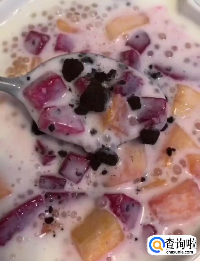 最后放入煮好的西米,撒上一些奥利奥饼干碎,搅拌均匀,美味的水果捞就制作完成啦!