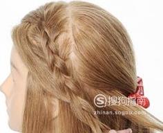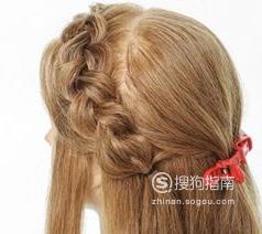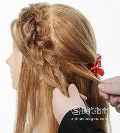 预留出前方的头发后,将发辫拉花扯松,并从右方取出一小束头发合并在发辫里。