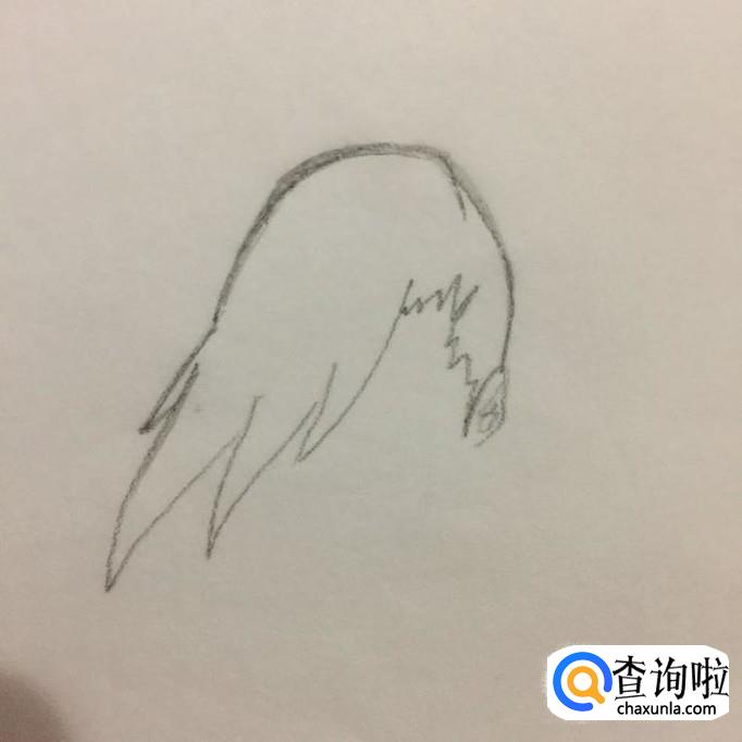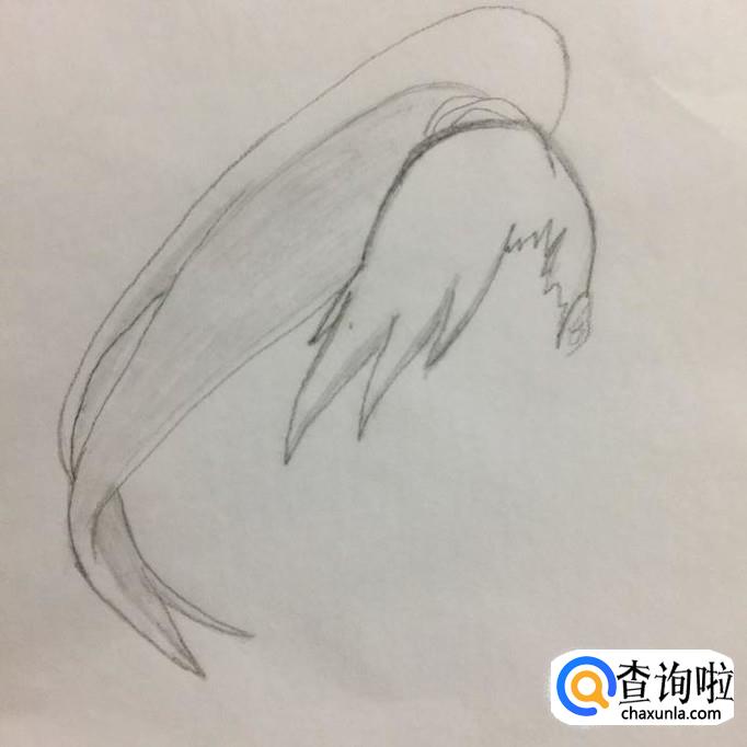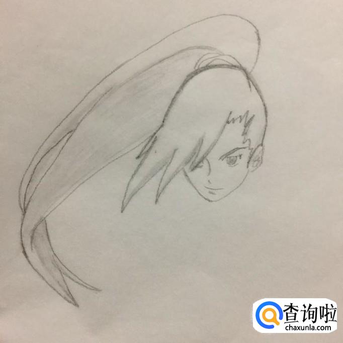 然后画出吉野的后半部分头发,如下图所示。画井野后半部分头发的时候,要特别注意要画的非常长,建议参考两倍前面头发的宽度为宜。为了让吉野后面的头发更有立体感,记得要在一部分头发上画出一些线条,轻轻描一下就可以了。
