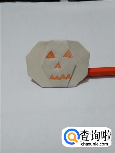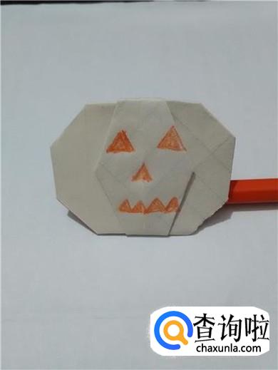 用笔在南瓜上面画几个三角形,表示眼睛、鼻子和嘴,纸南瓜就折完了。