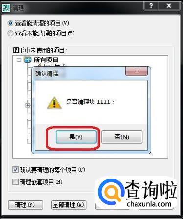 虽然屏幕上看不见多余的块,但点击清理之后,会出现提示“是否删除”,这是我们制图过程中留下的痕迹,我们点击“是”就可以了。清理完之后,如果清理掉的块很多,就能明显感觉到打开图形的速度快多了。