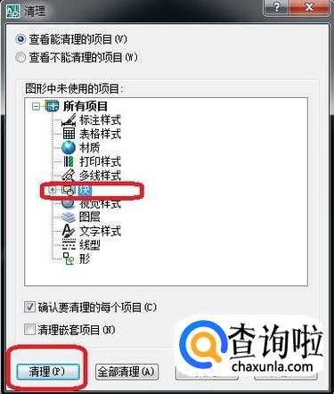 然后出现“清理”面板,如图所示,我们点击选中“块”,然后点击“清理”,就可以了。