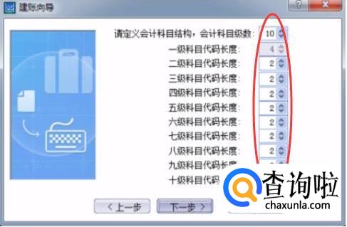 点击下一步,然后我们可以看到“定义会计科目结构,会计科目级数”界面的默认级数是10级。