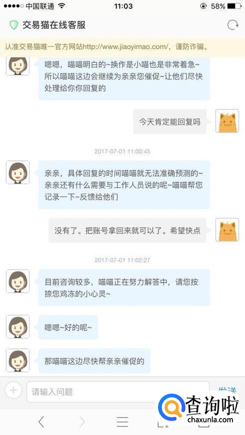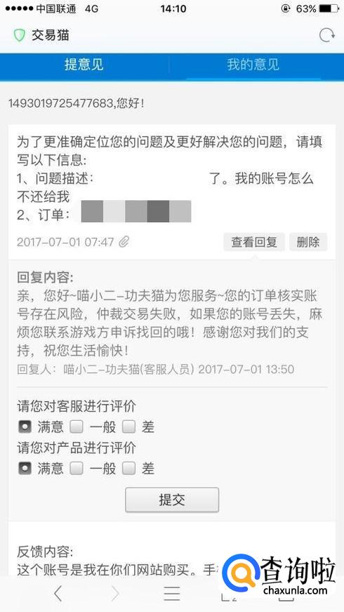 接着我们需要提供我们在交易猫上的交易信息,让官方人员能更快地处理,最后只需静待仲裁结果。