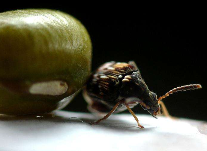 还有一类常见的仓储害虫是豆象,属鞘翅目豆象科。从市场买回的绿豆,一粒一粒很饱满,怎么过些日子后绿豆变成空壳了?仔细观察发现,那些空了的绿豆上有个小洞,洞里有个肉乎乎的小虫,那是绿豆象的幼虫。它的成虫体长2.5~3.5毫米,赤褐色,翅膀上有灰白色和黄褐色的毛斑,一年发生4~9代,各种虫态都能在豆粒中越冬。雌成虫在田间的豆荚上或仓库内的豆粒上产卵,孵化的幼虫会蛀入豆粒中。