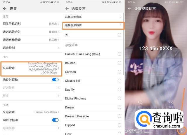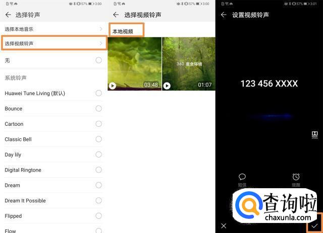 在设置页面找到【来电铃声】,点击该选项,然后点击【选择视频铃声】,在选择列表页中找到想要设置的视频,点击右下角的【√】即可完成设置。