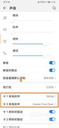 进入声音页面后,下滑页面,找到【卡1 来电铃声】和【卡2 来电铃声】。