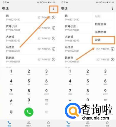 进入电话列表页面后,点击右上角的三点符号,然后在弹出的菜单中选择【设置】。