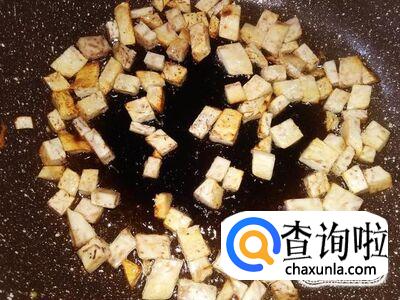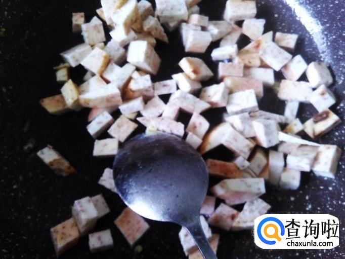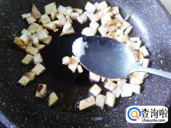 再开火下油,油量要比平常炒菜多些,然后放放香芋丁进去,加适量的盐。
