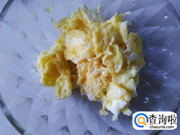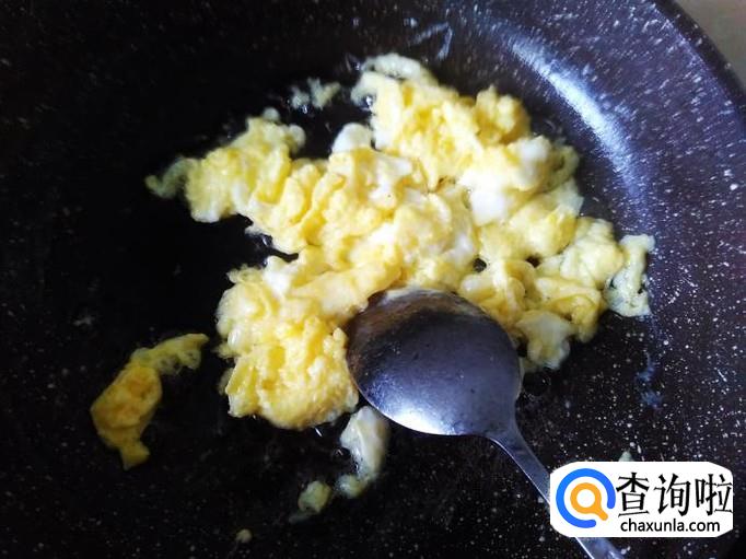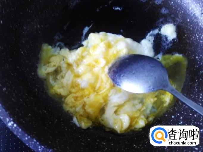 开火下油,放鸡蛋进去快速翻炒10秒左右铲上碗里。