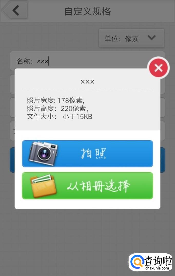 然后点击确定。会弹出拍照或从相册选择两个选择。我们按前面的要求拍摄照片或则从相册选择照片。这里会让你剪切照片,记得要露头露肩。