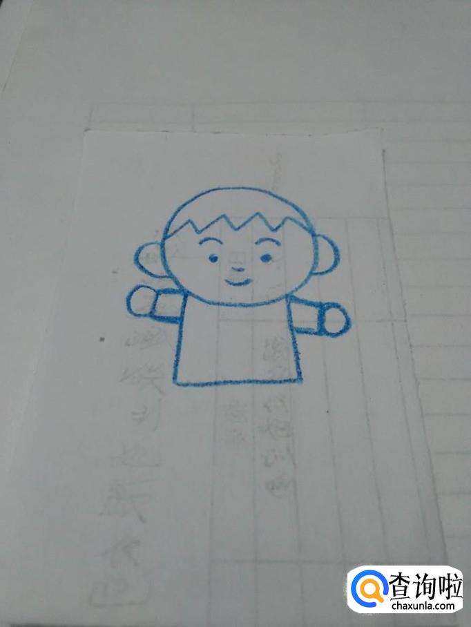 在头的下面画一个大的长方形和两个小长方形,表示上身和两只胳膊。