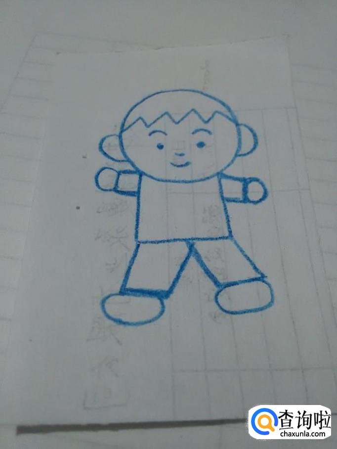 最后在头部下方画两个三角形,表示衣领,男孩就画完了。