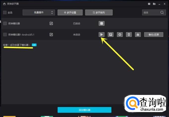 现在我们可以看到系统提示我们已经成功增加模拟器了,然后我们点击启动(如下图)
