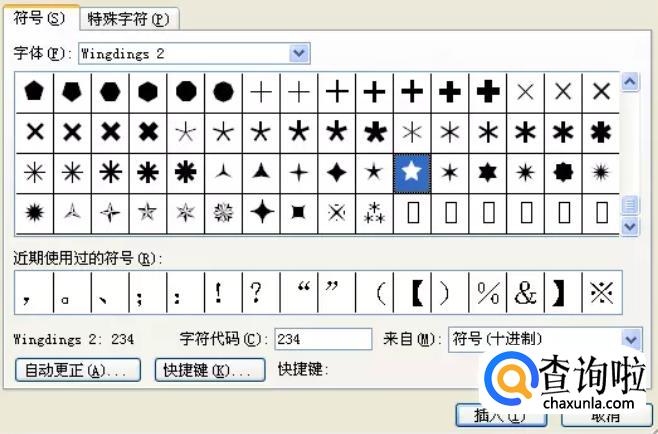打开Word,选择菜单栏的“插入”中的“符号”,然后在弹出的符号窗口的“字体”后面选择“Wingdings 2”,在下面拖到最下面,就可以看见“五角星符号”了,如下图。