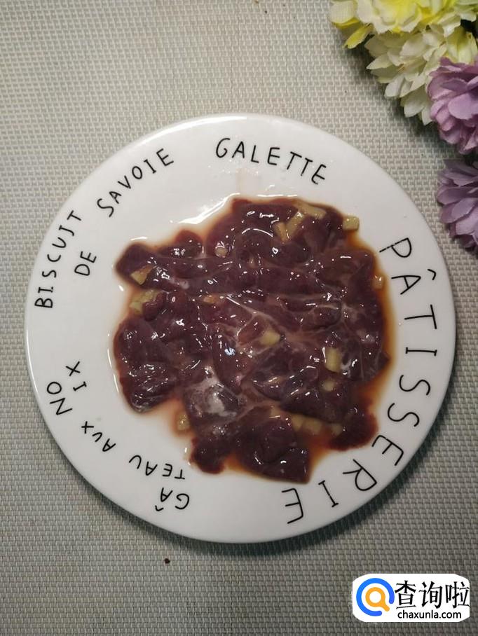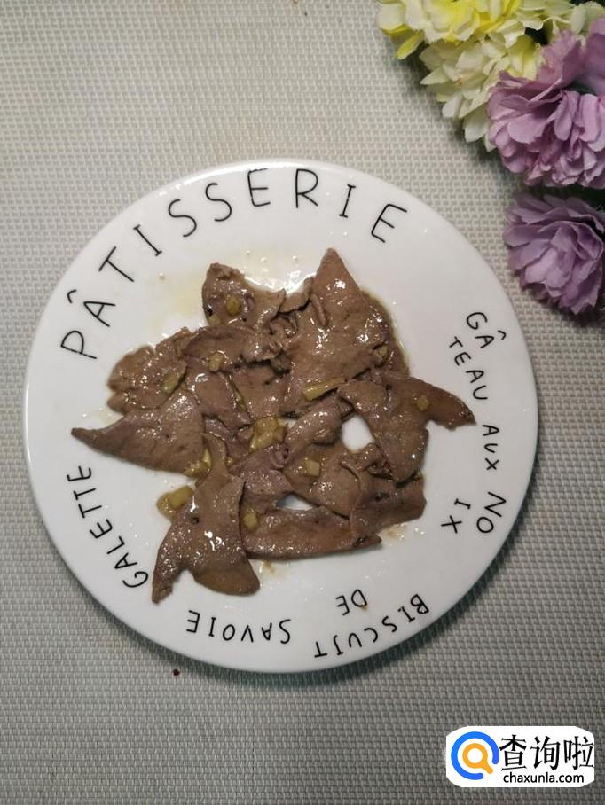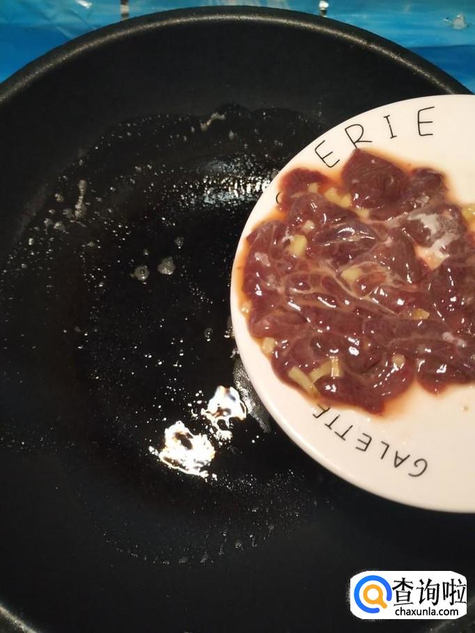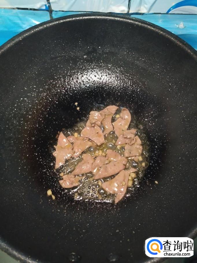 炒锅中放入适量油,油热后,将猪肝放入锅中爆香,出锅装盘备用。用淀粉腌过的猪肝,不容易炒老。