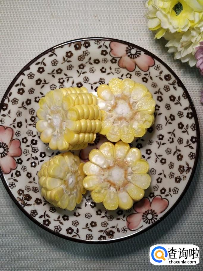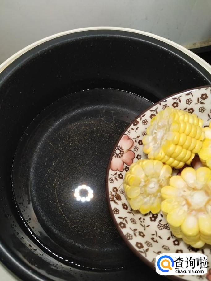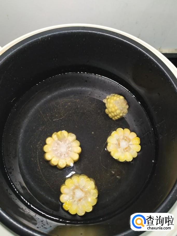 再准备适量新鲜的玉米,切开,将玉米倒入锅中。