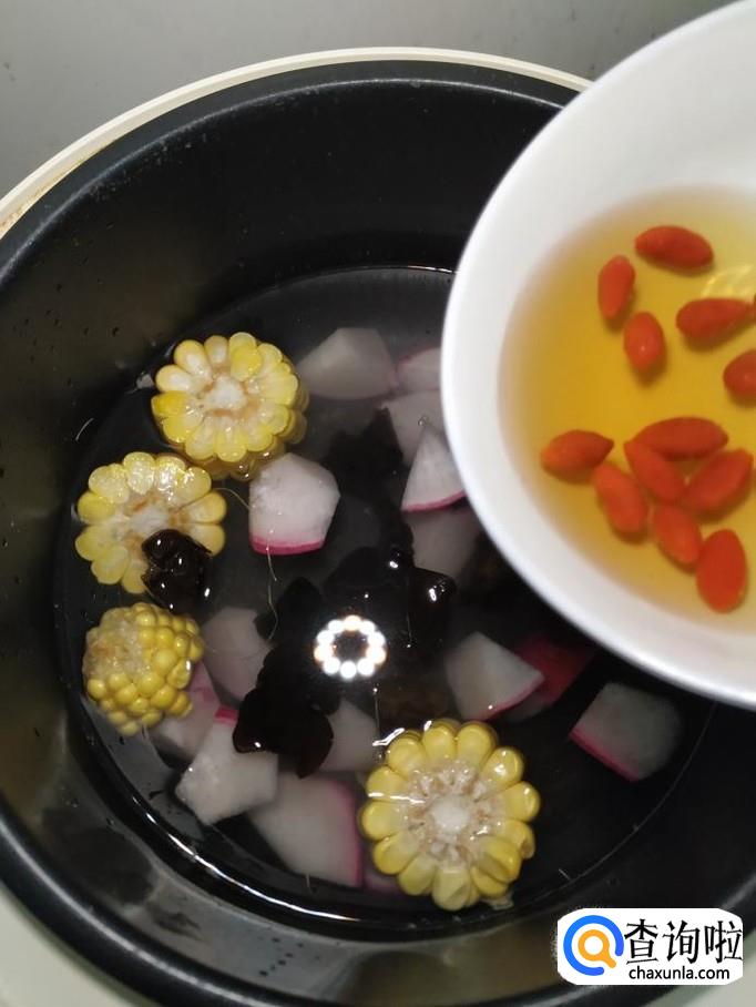 再准备适量木耳和枸杞子,用清水泡发,放入锅中,大火将水烧开,水开后转小火,炖30分钟左右。