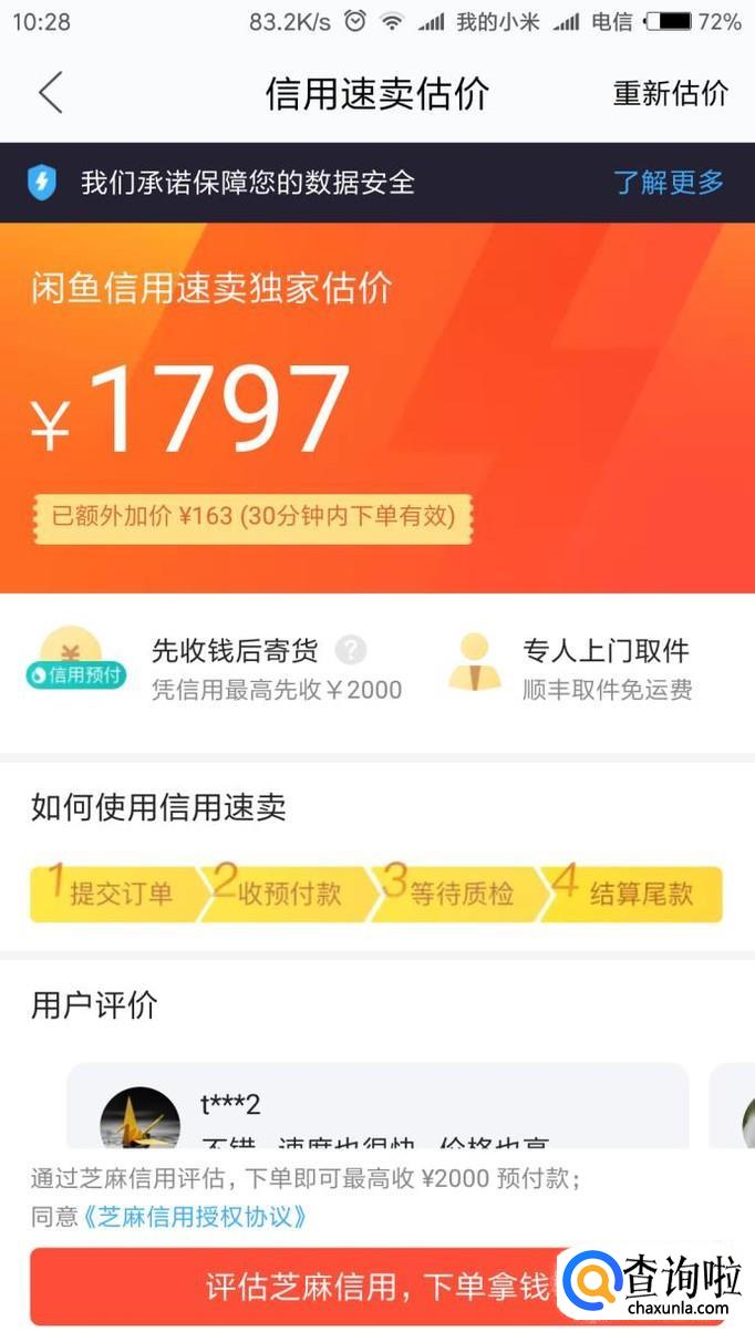 系统会根据所填信息估出商品的价格如果感觉价格合适,可以进行交易,那就点击下方“下单拿钱”吧;