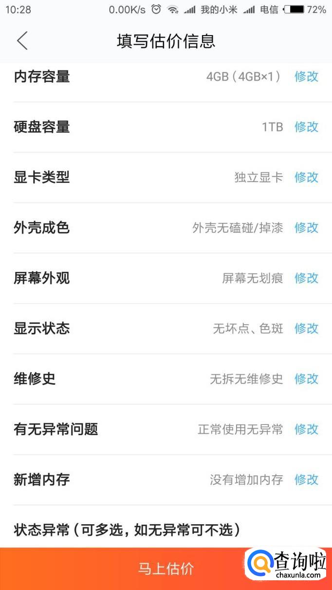 然后根据提示内容选择自己商品的配置信息,成色和外观程度,点击“马上估价”让系统出价格;