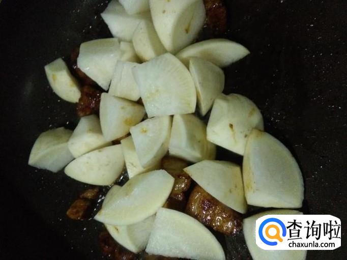 将萝卜下入锅中翻炒几下,倒入少许酱油炒匀